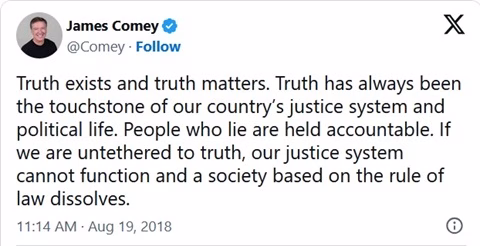 Trump fired Comey in May of 2017, and clearly he held onto his anger about losing one of the most powerful jobs in the nation, because Comey has continued to nip at Trump’s heels through social media posts. In August of 2018, when Trump was asked to submit to an interview as part of Special Counsel Robert Mueller’s bogus Russia investigation, Comey trotted out his rule of law admonishment to help legitimize the investigation.